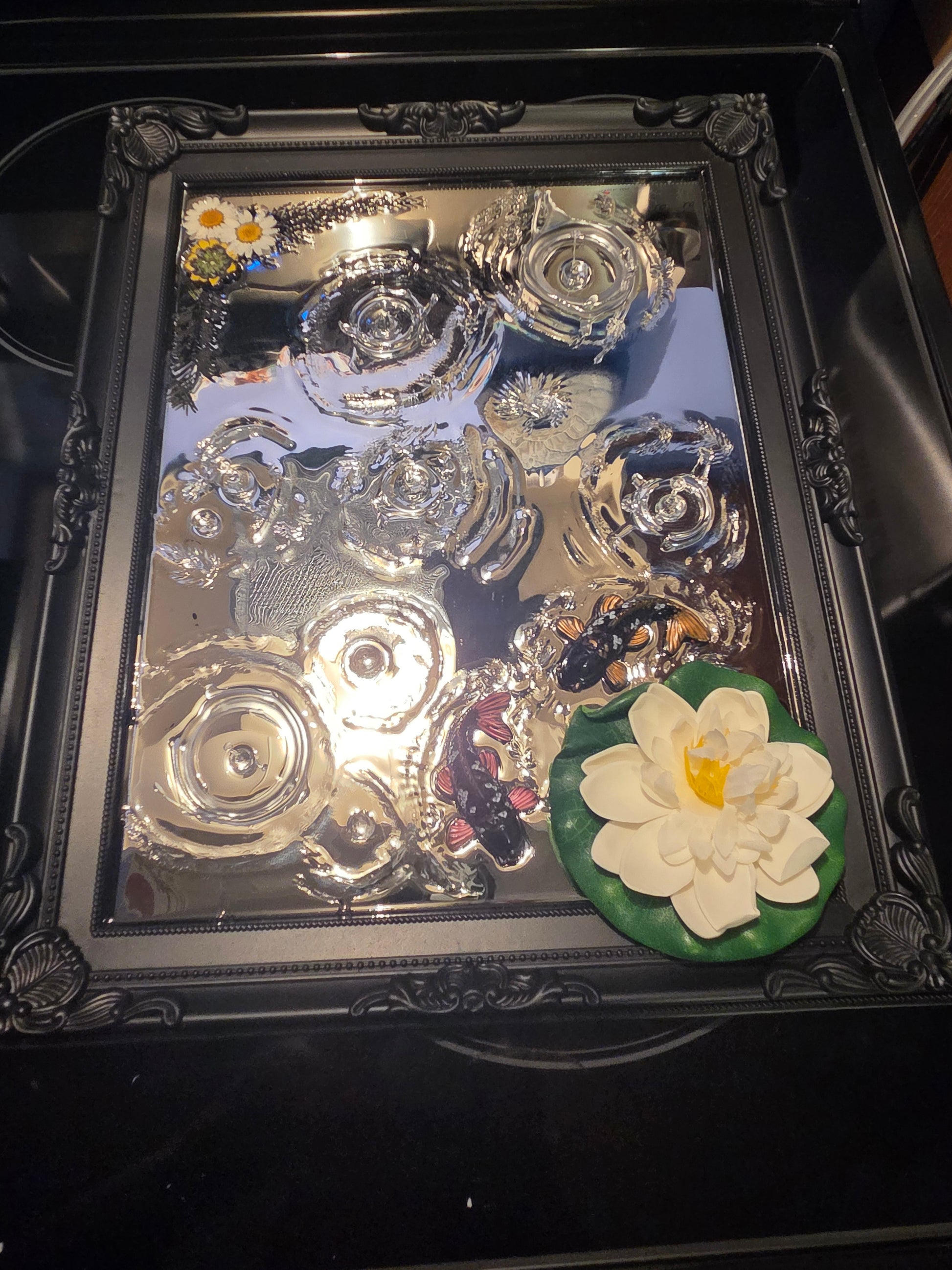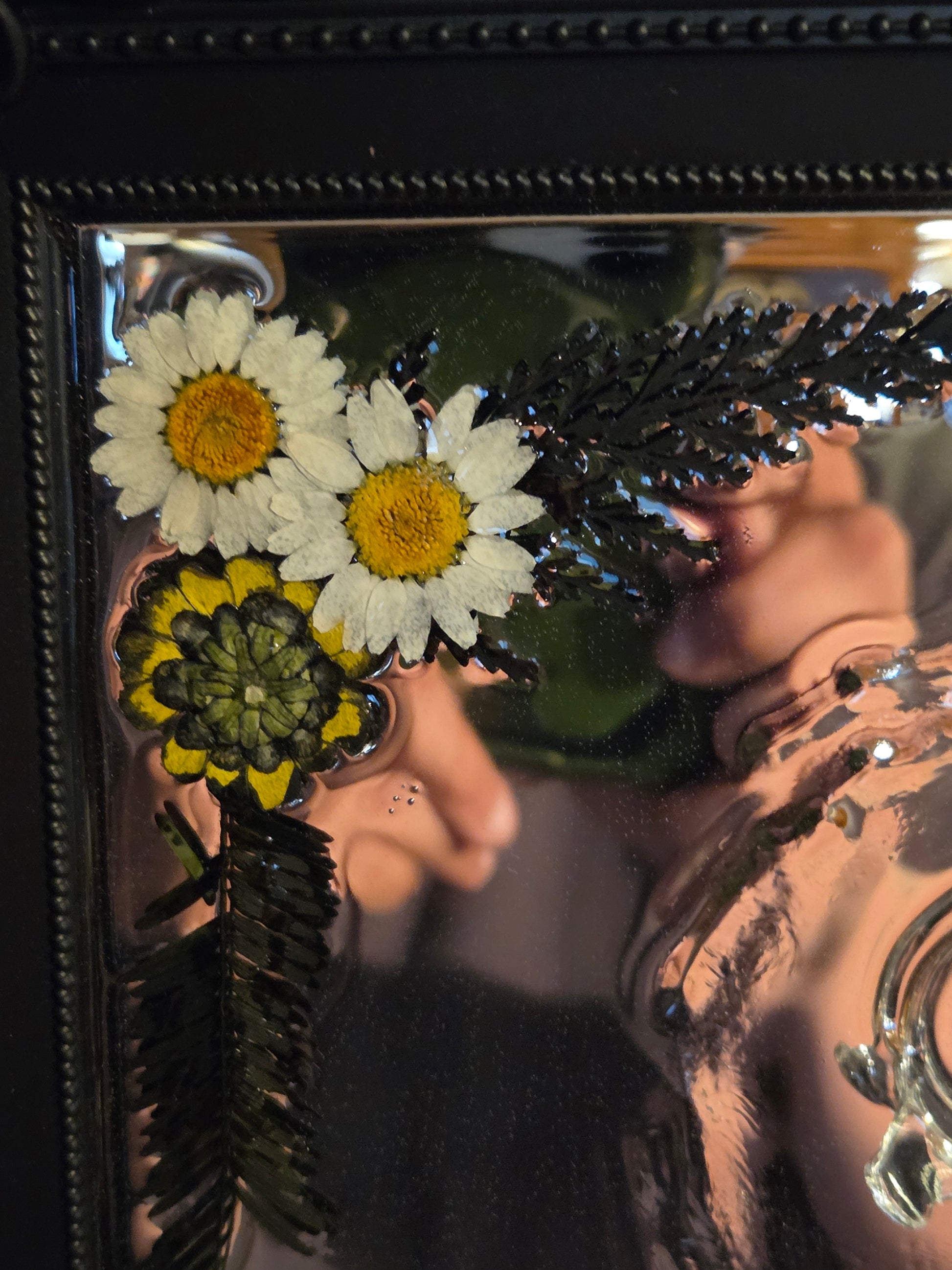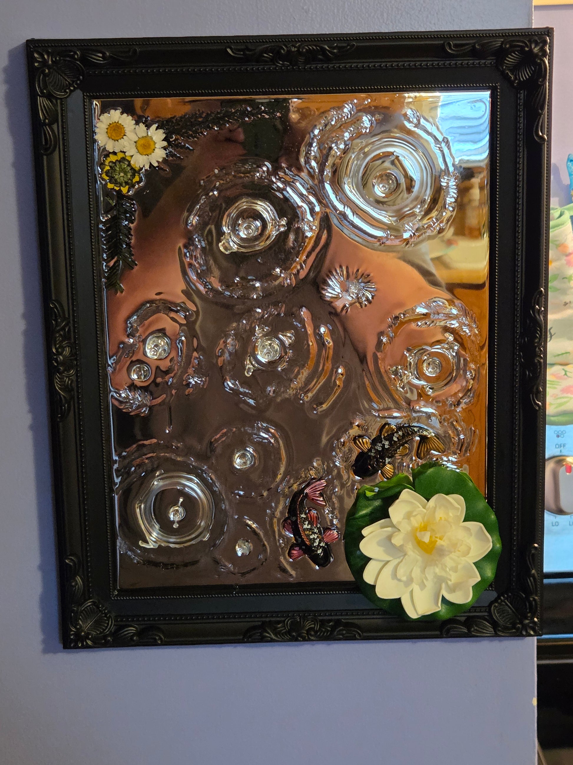 This framed 3d effects mirror features resin handmade effects! 15 inches 12 inches, this is a big piece of art ready for your wall!